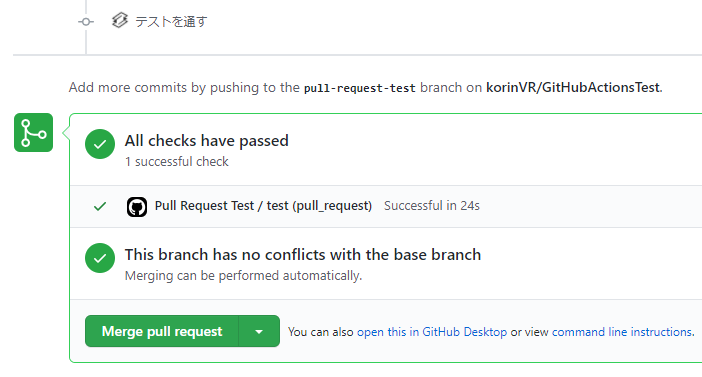 プルリクエストすると、mainブランチにマージ後のコミットがチェックアウトされ、UnityのPlay ModeおよびEdit Modeテストが実行されてGitHub上に結果が表示されます(Unityのテストの作り方についてはここでは説明しません)。
