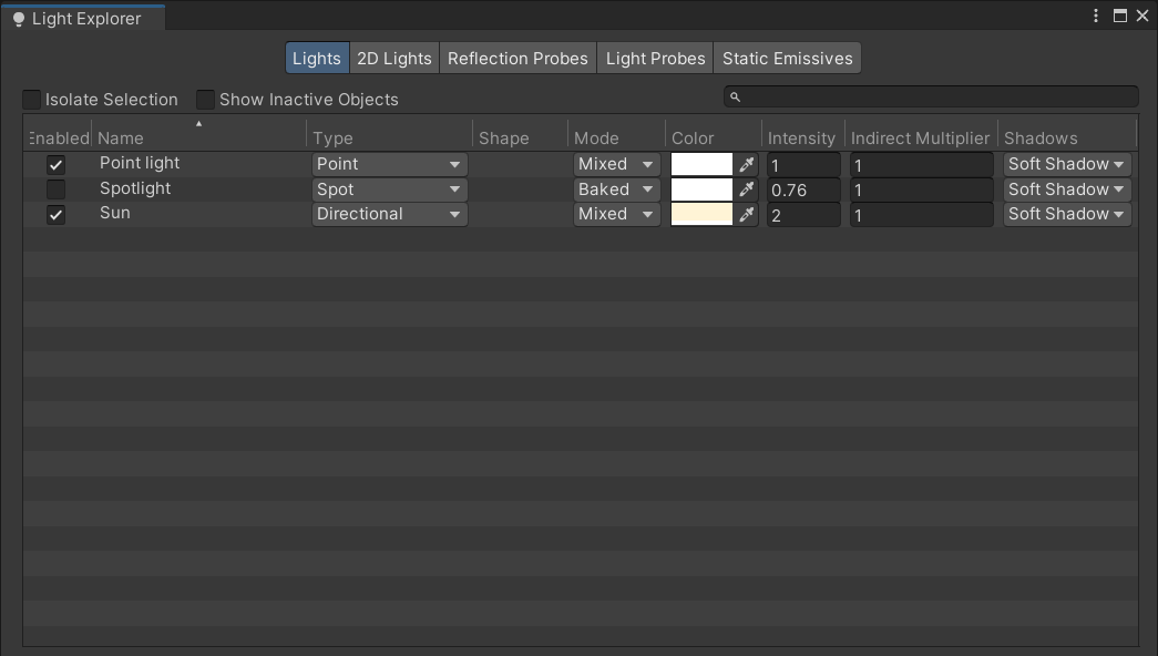 また、アセットに不要なライトや発光するオブジェクトが含まれていることがあります。Light Explorerを使用すると、シーンに配置されているライティングに影響するオブジェクトを一覧表示できますので、これで確認してみてください。Window > Rendering > Light Explorerで開きます。