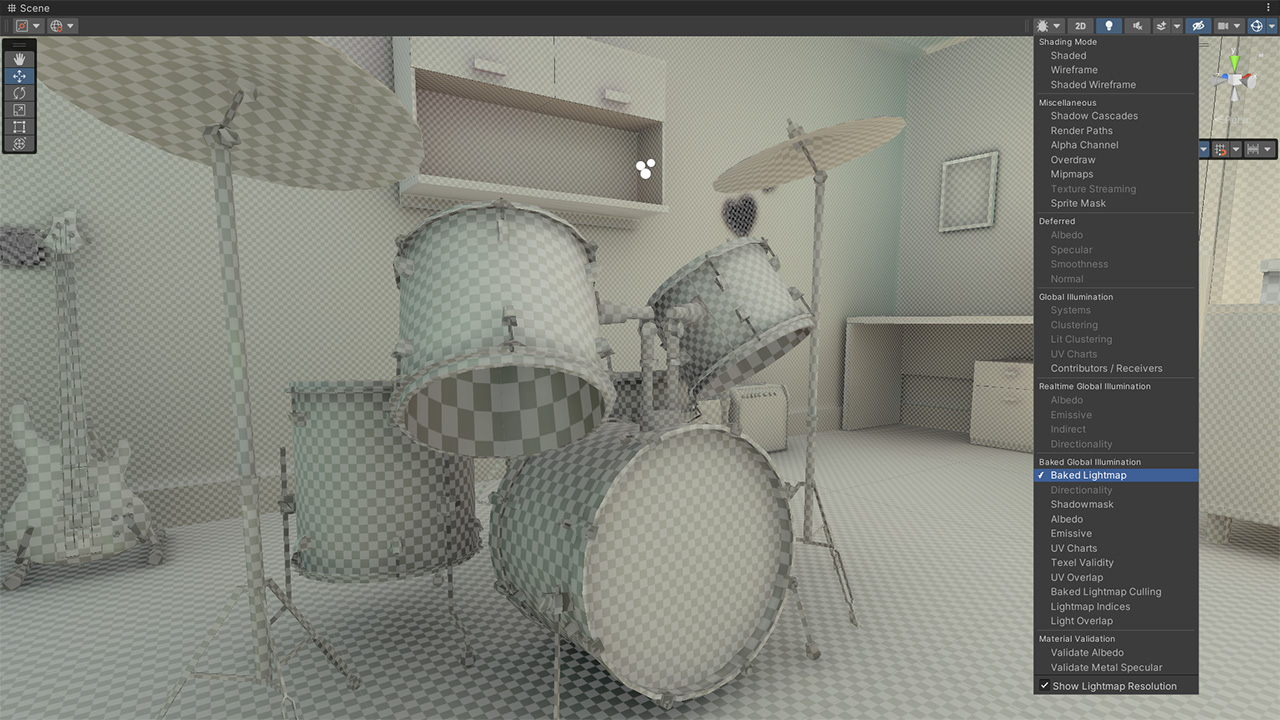Sceneビューのプルダウンメニューから表示をBaked Lightmapに変更して、さらにメニューの一番下のShow Lightmap Resolutionをオンにすると、メッシュごとのライトマップ解像度を視覚的に確認できます。解像度が過剰だったり不足しているメッシュはMesh RendererのScale in Lightmapで調整できます。