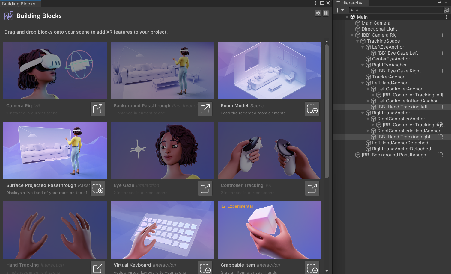 Oculus Integration 57.0からBuilding Blocksという機能が入りました。Oculus > Tools > Building Blocksで下のようなウィンドウが開いて、必要な機能をクリックしていくだけでカメラリグを組み立てたり、プロジェクトの自動設定をしてくれたりするようになっています。最初のセットアップが簡単になるので試してみるといいでしょう。