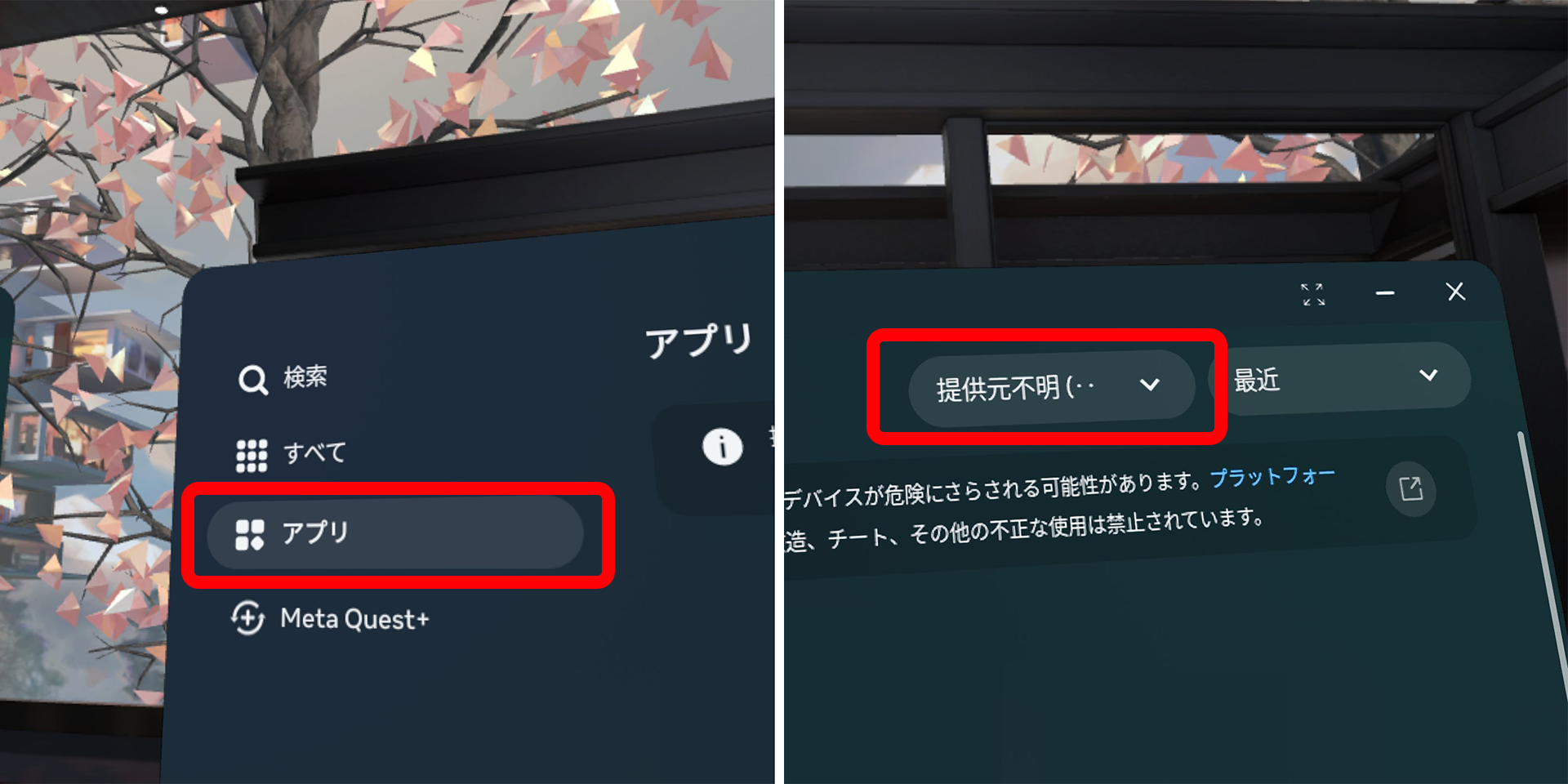 ビルドして実機に転送したアプリは、Questに格納されていていつでも実行できます。ライブラリのウィンドウの左に並んでいるタブから「アプリ」を選択して、右上から2番目のドロップダウンメニューで「提供元不明」を選択すると出てきます。