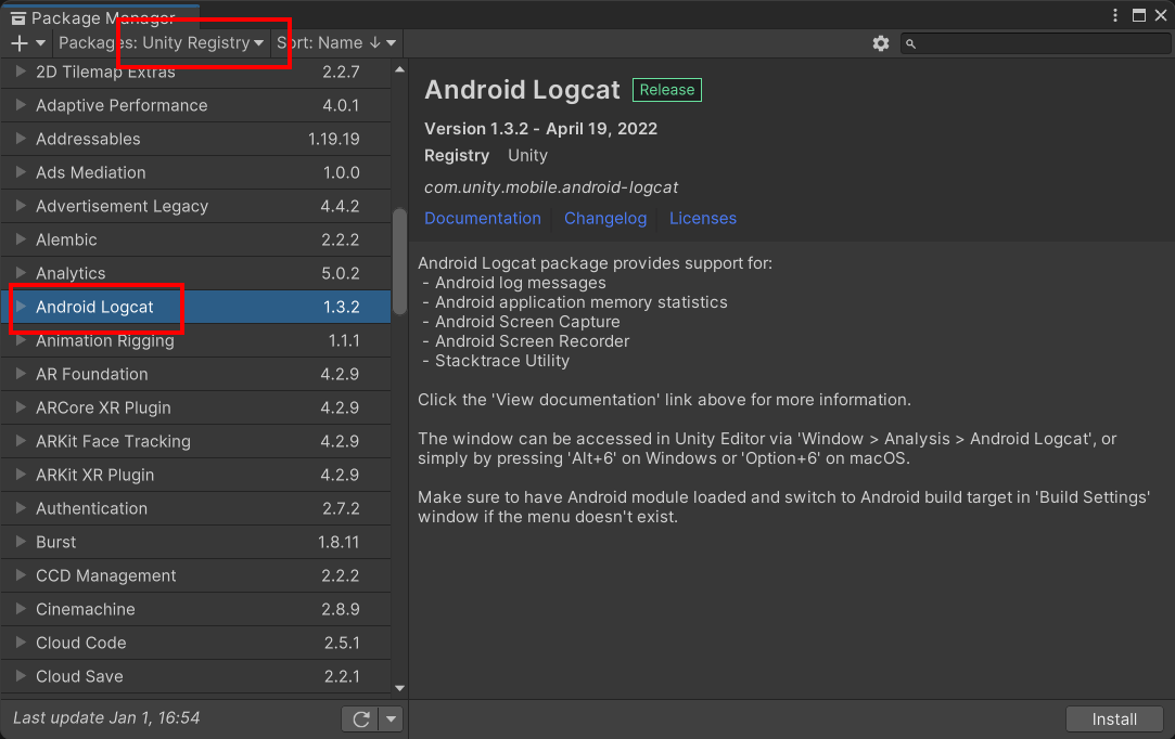 UnityのAndroid Logcatパッケージをインストールすると、Quest実機のエラー出力等を確認できます。Window > Package Managerで左上のPackagesをUnity Registryにすると出てきます。