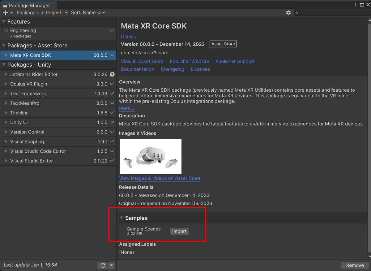 最低限必要なパッケージです。従来のOculus IntegrationのVRフォルダ相当が含まれていて、パッケージのSamplesから基本的なサンプルシーンがインストールできます。