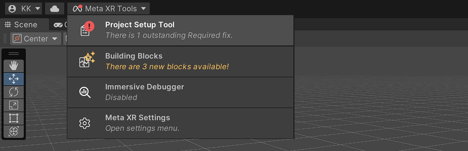 Unityが再起動すると、左上に赤いドットのついた「Meta XR Tools」のボタンが追加されています。