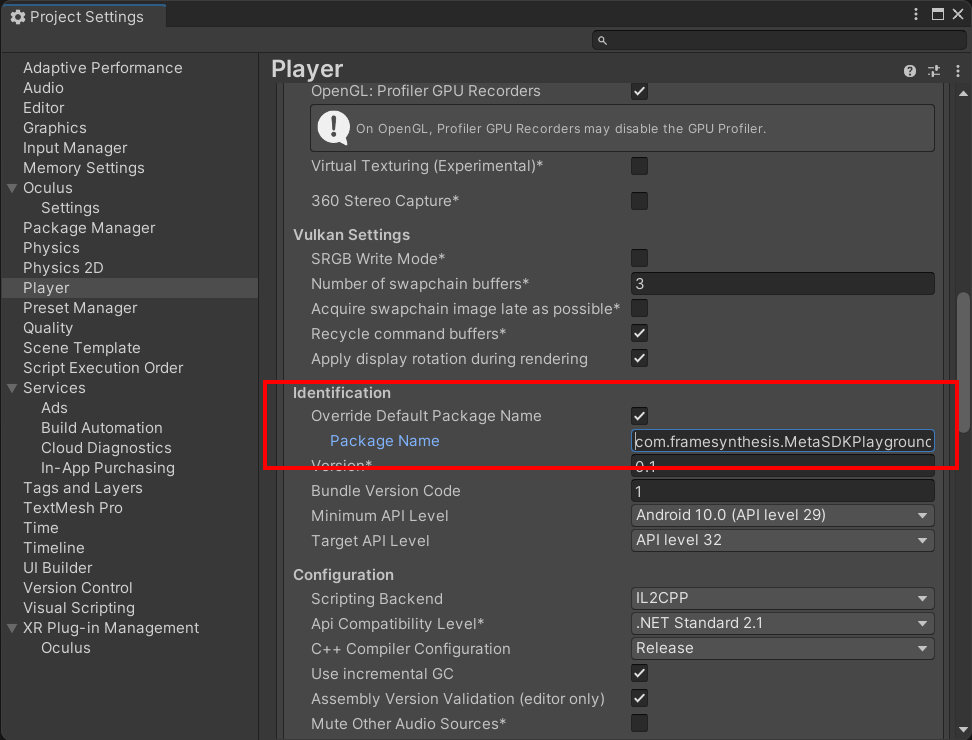 QuestアプリはProject SettingsのPlayer > Package Nameをもとに識別されます(つまり、Package Nameを変えると別のアプリとして認識されます)。通常、ドメイン名を逆順にした「com.[会社名].[プロダクト名]」のような名前をつけます。