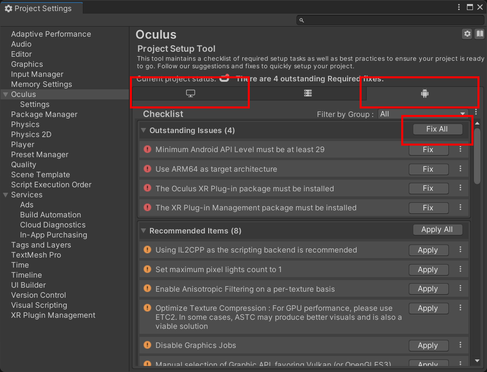これをクリックして「Project Setup Tool」を選択すると、以下のようなProject Settingsのページが開きます。このページで、UnityのXRプラグインの有効化や各種推奨設定を一括で自動的に行うことができます。ひとまずWindowsとAndroidのタブでそれぞれ「Fix All」をクリックして全部緑にしてください。