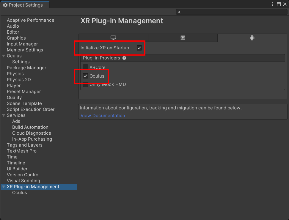 UnityのXRプラグインシステムであるXR Plug-in Managementが有効化され、Oculus XR Pluginがインストールされて、Project Settings > XR Plug-in Managementに下記チェックボックスが入っているはずです。これによりプロジェクトがVRモードで動作するようになります。