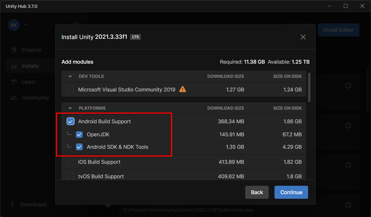 Unity HubでUnityをインストールします。インストールするときに、モジュールの追加でAndroid Build Supportのところにすべてチェックを入れてください。