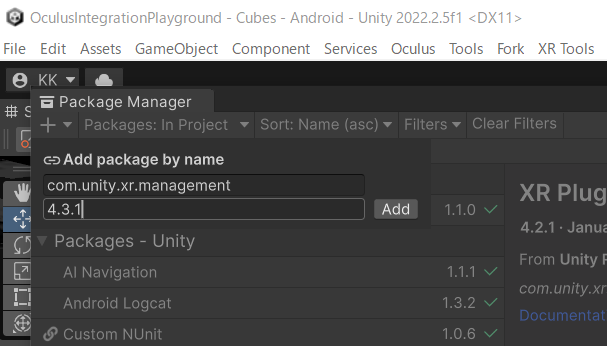 - Window > Package ManagerでXR Plug-in ManagementパッケージとOculus XR Pluginパッケージのバージョンを確認して必要なら更新します。