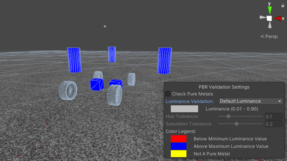 Sceneウィンドウの表示モードをValidate AlbedoまたはValidate Metal Specularに変更すると、シーン内のPBRマテリアルの検証ができます。Luminance Validationを変更するとWorn AsphaltやFresh Snow等、マテリアルが典型的な輝度の範囲に入っているかチェックできます。
