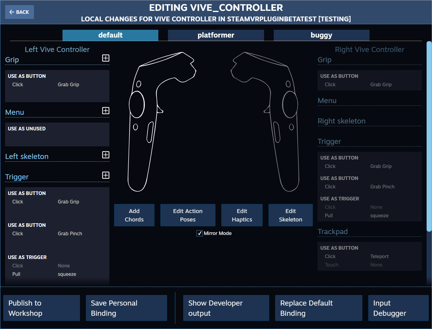 - 「Open Binding UI」でEditでモーションコントローラーのバインド設定を開いて、右下の「Input Debugger」