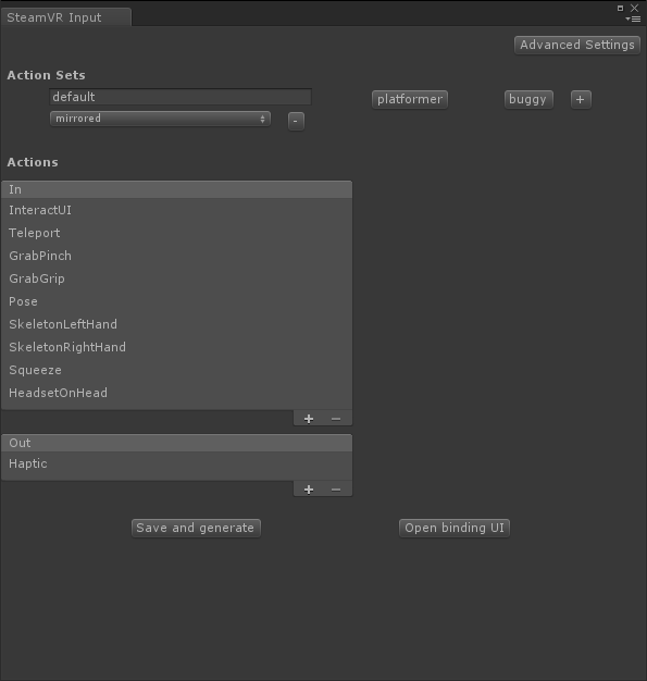 SteamVR プラグインをインポートすると、デフォルトのアクションセットが定義されています。若干分かりにくいのですが、ここでは「default」「platformer」「buggy」の3つのアクションセットが作成されていて、それぞれボタンを押すとアクション一覧が表示されます。