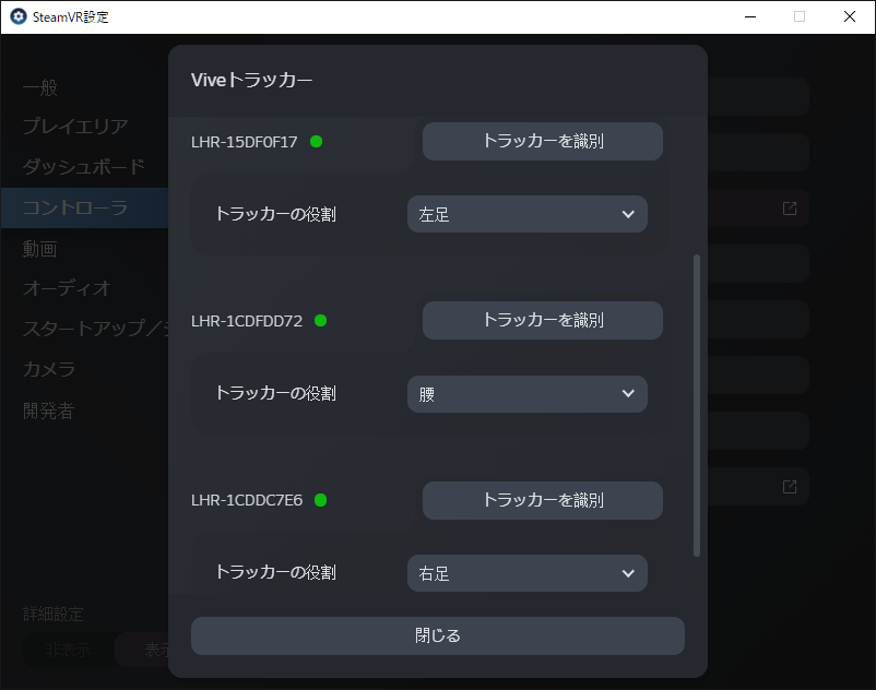 - SteamVR のメニュー>デバイス>トラッカーの管理>VIVEトラッカーの管理で、各トラッカーの役割を設定(ここで「トラッカーを識別」をクリックすると該当のトラッカーのLEDランプが点滅します)