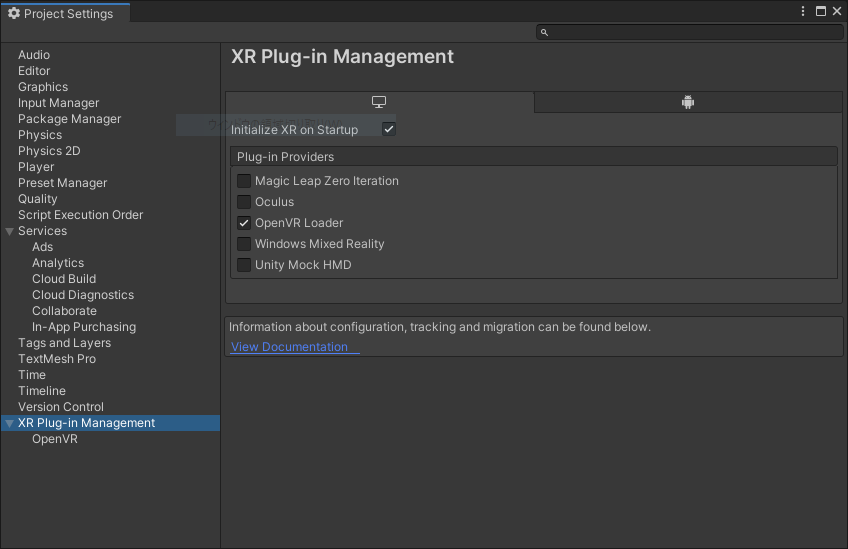 Unity > Edit Project Settings… で、下記イメージのように左の列に XR Plug-in Management と OpenVR の表示があり、OpenVR Loader のチェックが入っている状態が正常です(なかなかすんなり行かないことがあって、プロジェクトファイルを開き直す等が必要っぽい)。