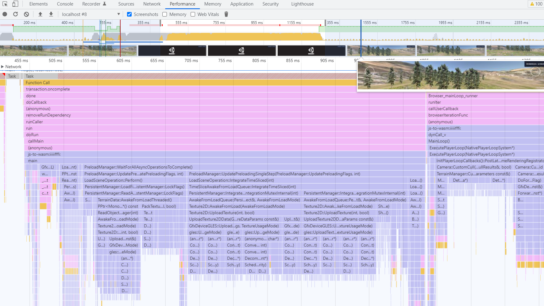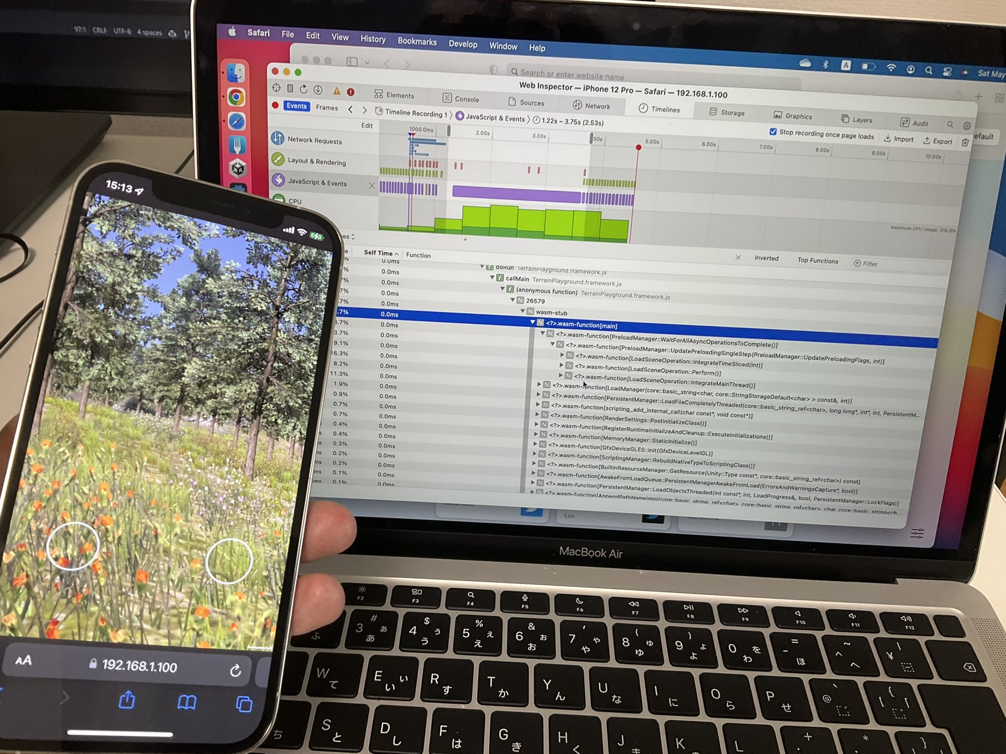 どのブラウザのエンジンも何段かのコンパイラを持ち、.wasmをロードしつつ速やかに(低速で)実行を開始する一方、バックグラウンドでより最適化されたネイティブコードを生成して徐々に入れ替えていくという挙動のようです。このため、ユーザーが.wasmファイルをロードしてコンパイルがある程度進行するまで、フレームレートの低下やヒッチが発生する場合があります。