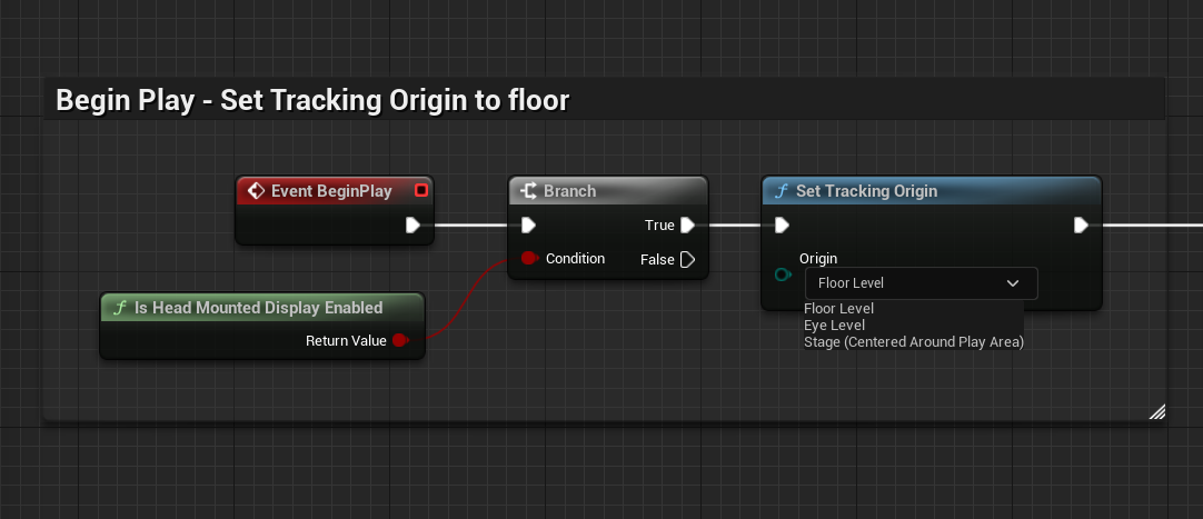 Virtual Realityテンプレートでは、VRPawnのEvent BeginPlayでSet Tracking Originが実行されています。デフォルトでは床を基準にしたFloor Levelになっていますので、必要ならEye Levelに変更した上で、レベルのPlayer Startをプレイヤーの頭の位置に移動します。